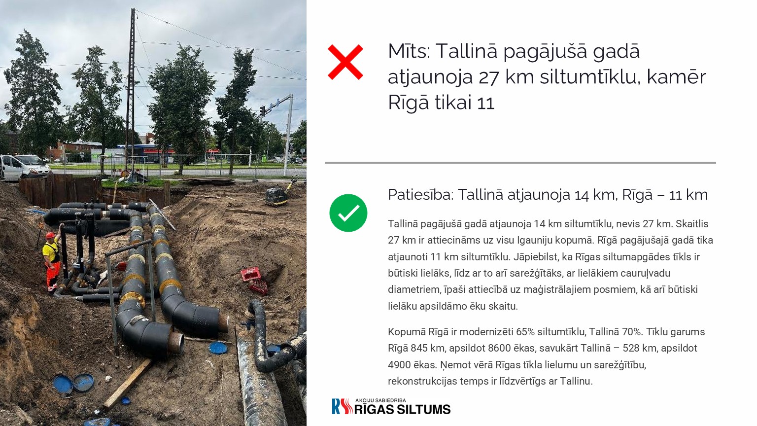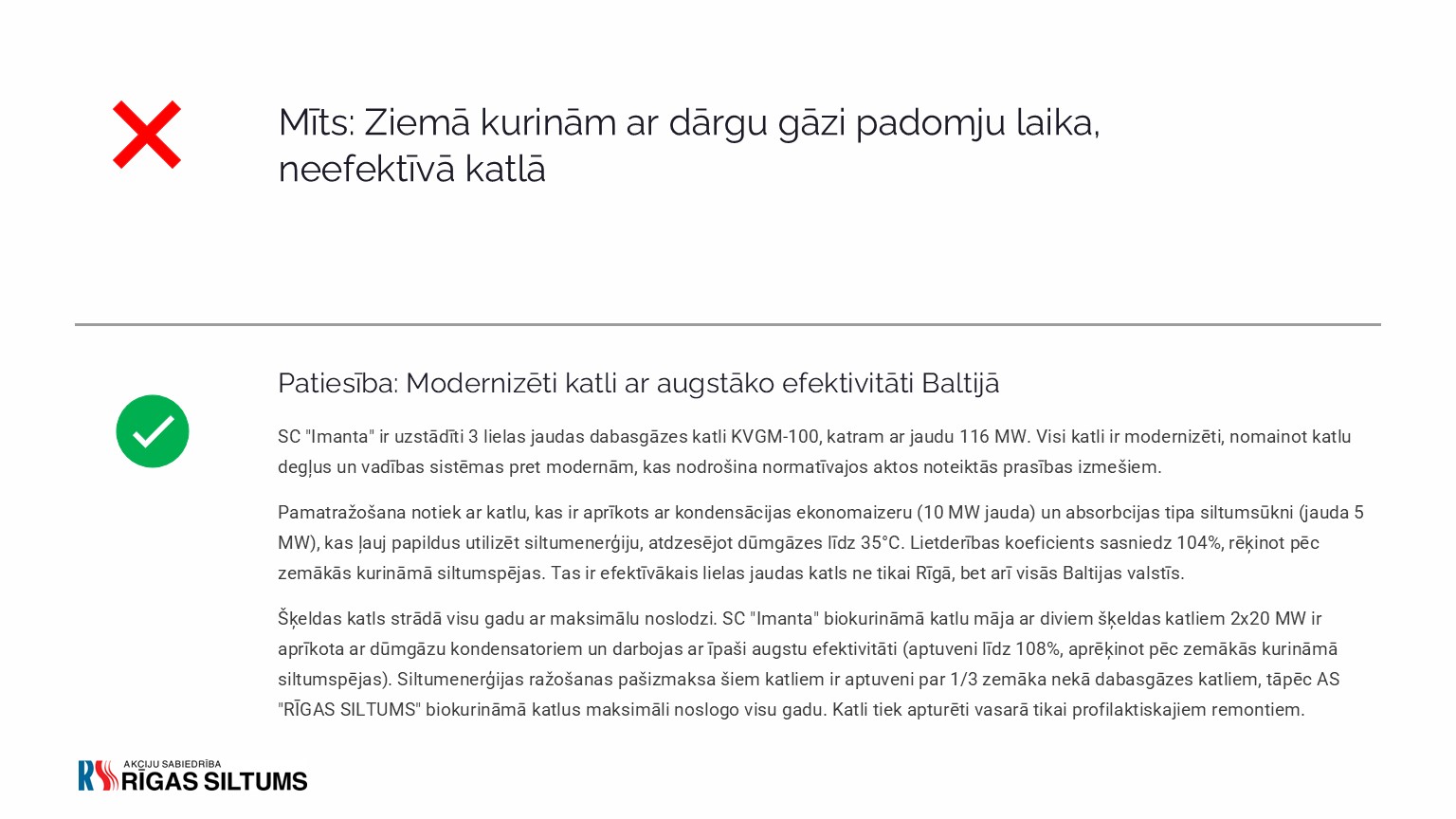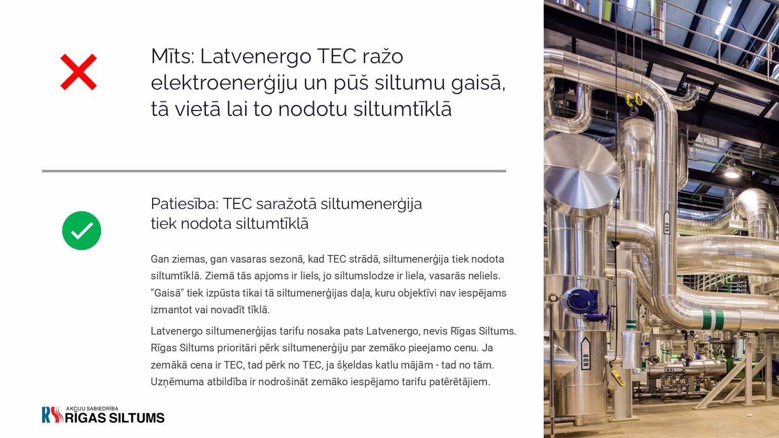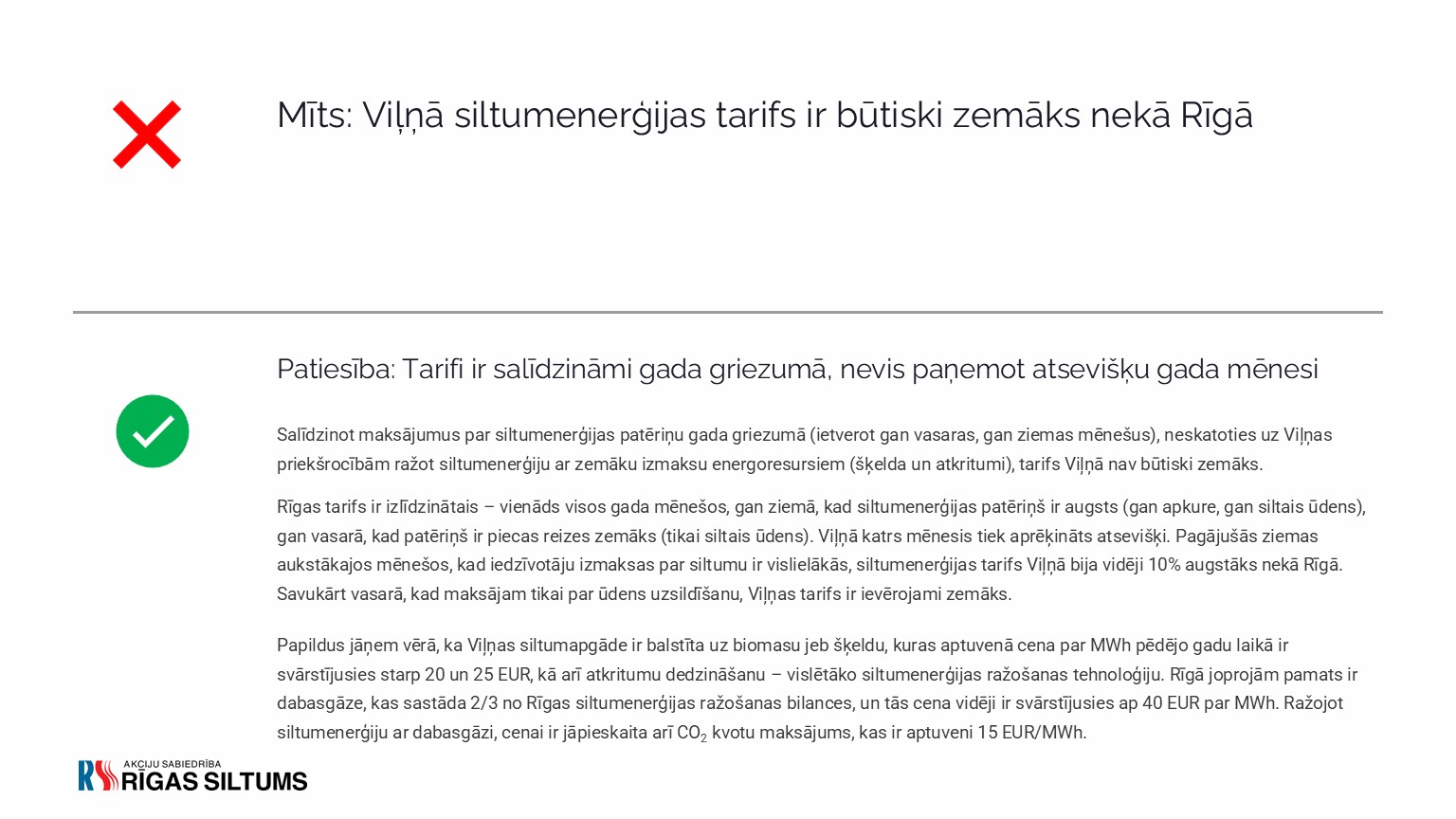 Skaidrojam publiski izskanējušos mītus un nepatiesos apgalvojumus par siltumapgādes jomu Rīgā, tarifiem Baltijas valstu galvaspilsētās, uzņēmuma izmantotajām tehnoloģijām un to efektivitāti. Iepazīstieties ar detalizētu informāciju, kas balstīta uz konkrētiem datiem un faktiem!