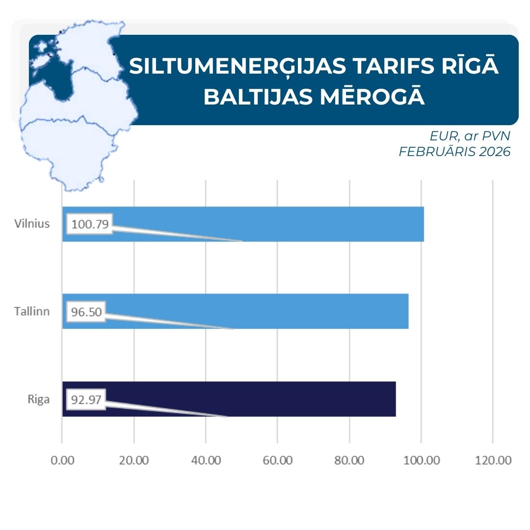 Siltumenerģijas tarifs Rīgā 2026. gada februārī, EUR ar PVN salīdzinot ar Pierīgu, Latvijas lielajām pilsētām un Baltijas valstu galvaspilsētām