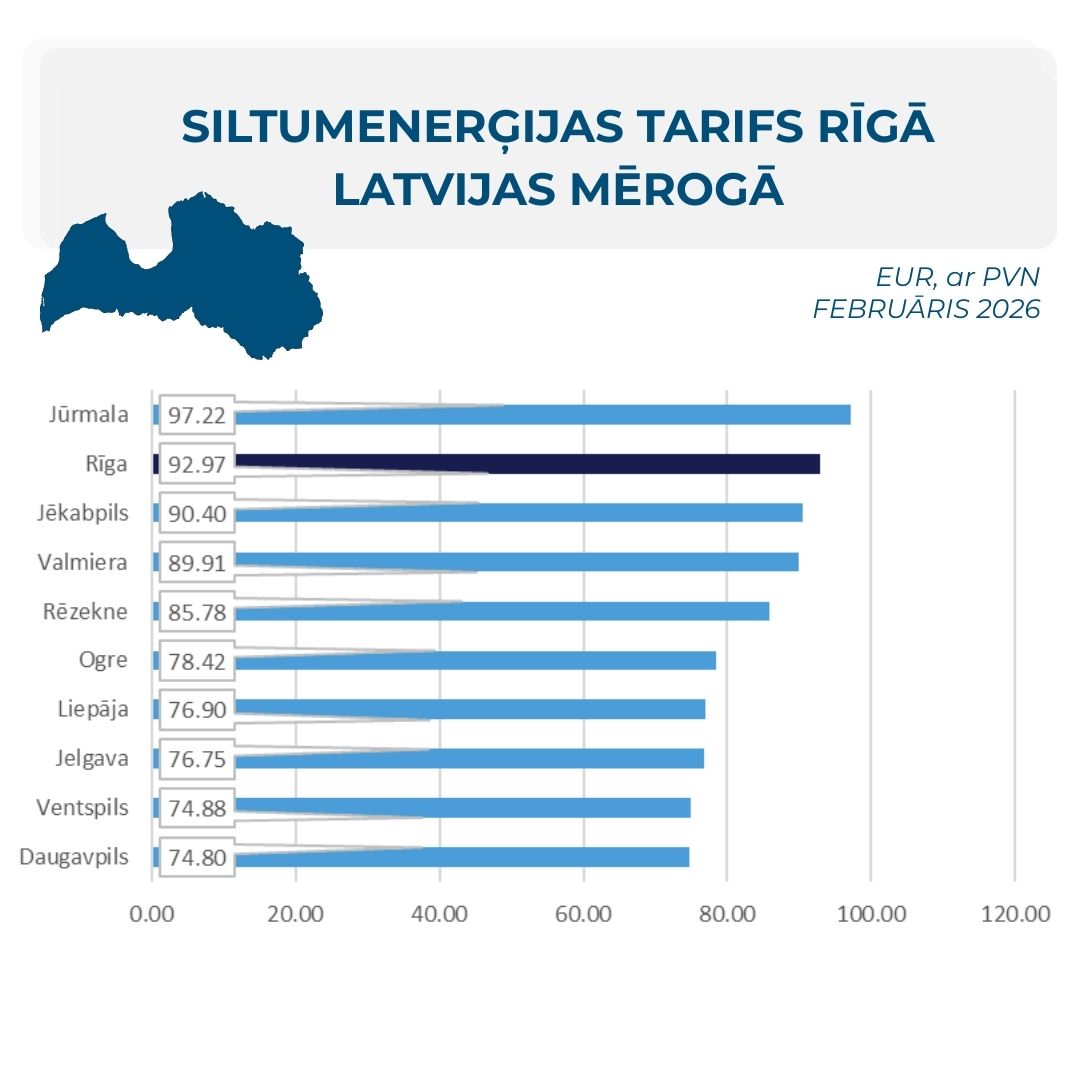 - Latvijas mērogā: Starp 10 lielākajām pilsētām Rīgas tarifs ir par 9 € augstāks par vidējo, ko ietekmē izmantoto energoresursu cenas, pilsētas mērogs un nepieciešamās investīcijas sistēmas drošībā.