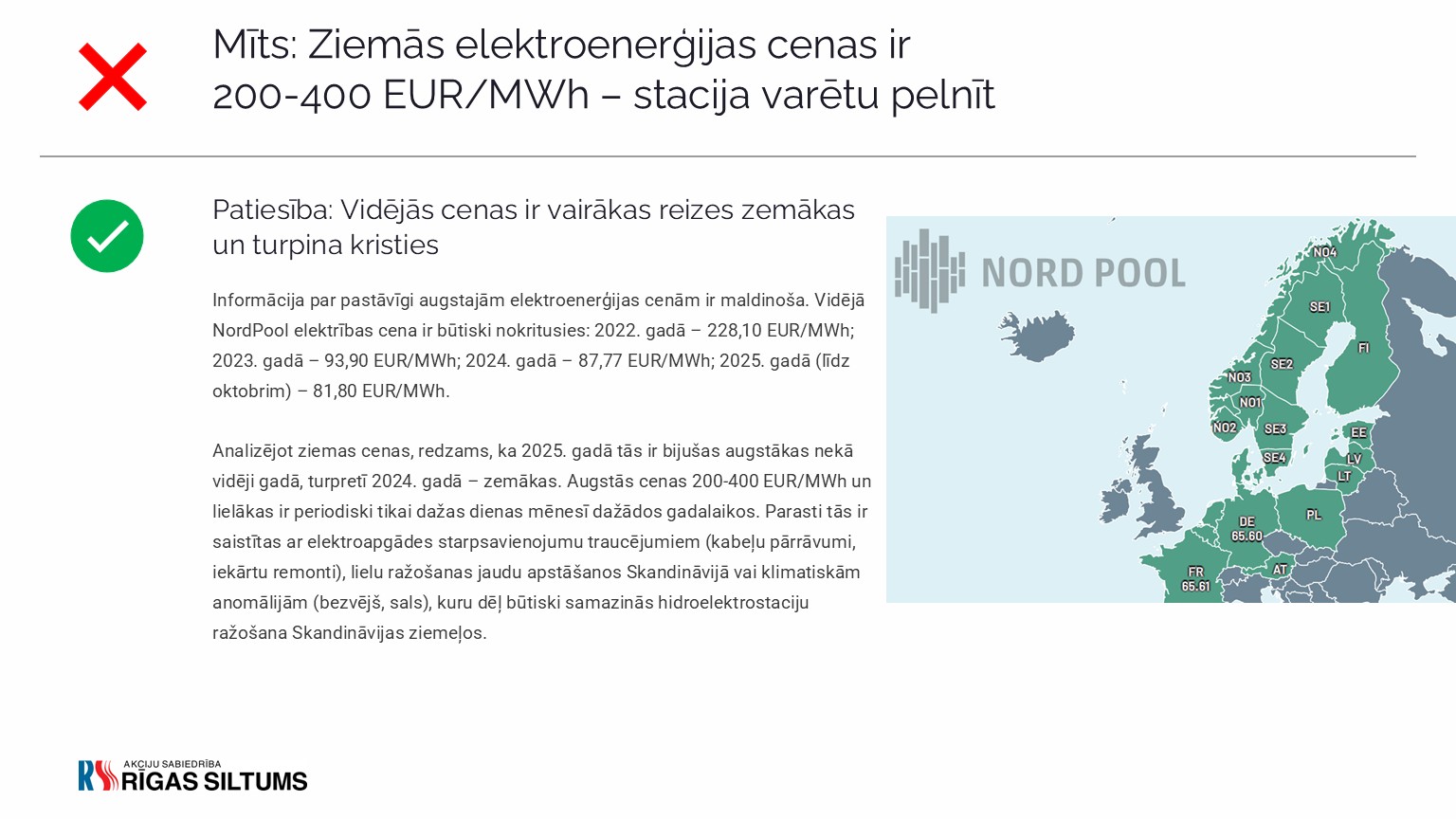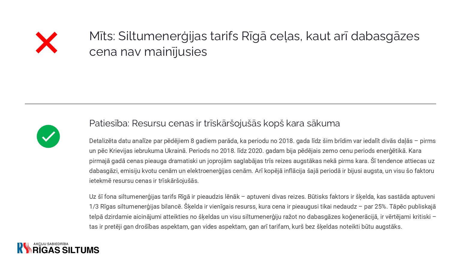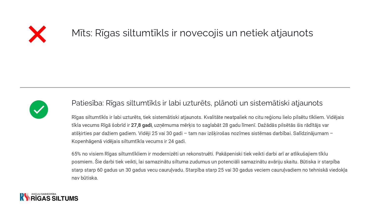 Skaidrojam publiski izskanējušos mītus un nepatiesos apgalvojumus par siltumapgādes jomu Rīgā, tarifiem Baltijas valstu galvaspilsētās, uzņēmuma izmantotajām tehnoloģijām un to efektivitāti. Iepazīstieties ar detalizētu informāciju, kas balstīta uz konkrētiem datiem un faktiem!