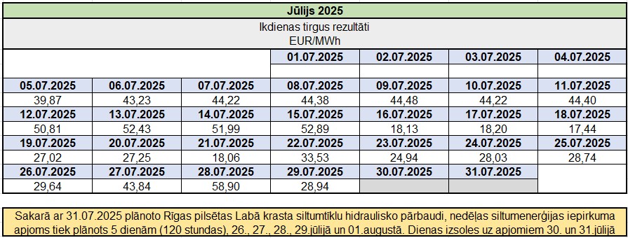 Periodā no 03.08.2024. plkst.00.00 līdz 10.08.2024. plkst.00.00 siltumenerģija 12400 MWh apjomā tiks iepirkta par vidējo cenu 35,35 EUR/MWh.
