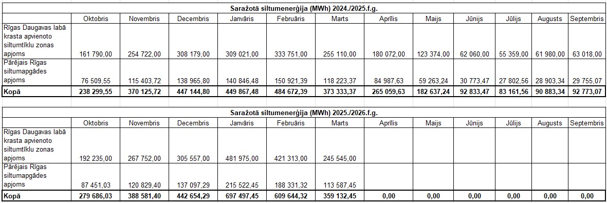 Saražotās siltumenerģijas apjomi Rīgā 2024/2025. un 2025./2026. gada apkures periodā