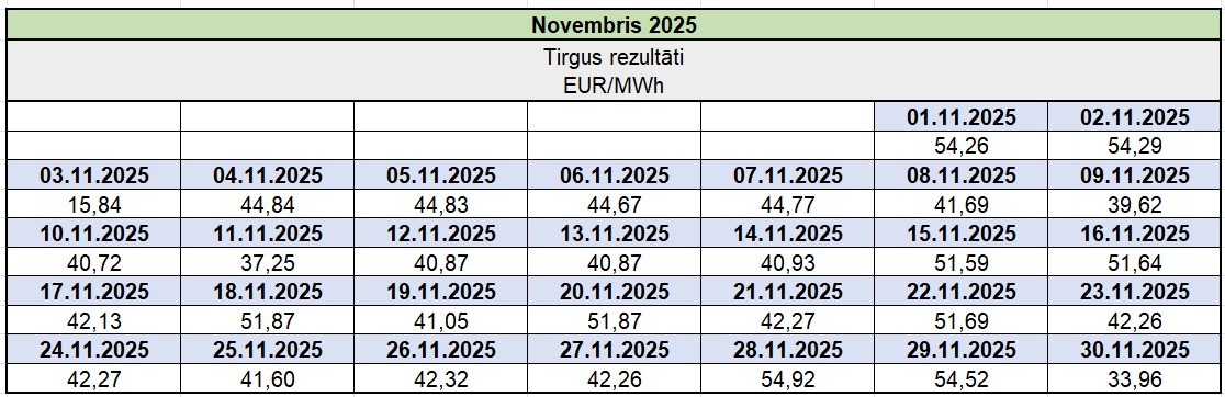 Periodā no 04.11.2023. plkst.00.00 līdz 11.11.2023. plkst.00.00 siltumenerģija 19495 MWh apjomā tika iepirkta par vidējo cenu 63,08 EUR/MWh.